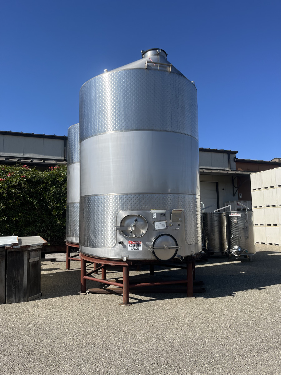 (2) 6,164-Gallon Jacketed Stainless Steel Wine Tanks – Slope Bottoms We are offering two 6,164-gallon stainless steel wine tanks with glycol jackets and slope bottoms, available for immediate sale. Both tanks are fully functional and suitable for wine storage and fermentation. One tank is in good overall condition, while the second has some cosmetic dents but remains structurally sound and continues to hold wine without issue. These tanks are a solid, cost-effective option for wineries looking to expand capacity or add additional storage. Features: Capacity: 6,164 gallons each Quantity Available: 2 Material: Stainless steel Jackets: Glycol jacketed Bottom: Slope bottom design Condition: One tank in good condition One tank with cosmetic dents (fully functional) Application: Fermentation and storage Availability: Immediate Contact us for pricing, photos, and additional details.